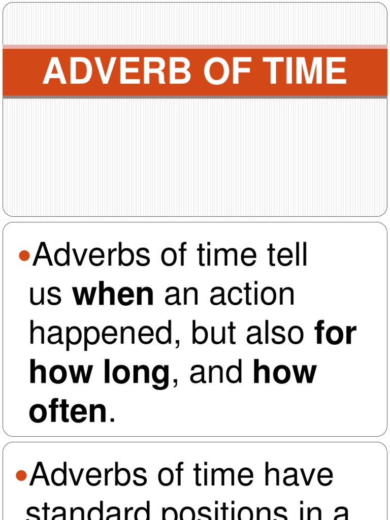 Some adverbs tell us when something happened or will happen. Adverbial expressions with definite timing are used when actions can be marked on a timeline (clock/calendar). Before, after, as, when, while, until, as soon as, since, no sooner than, as long as etc. An adverbial phrase is one or more words that modify the verb in a sentence. An adverb of time is an adverb that describes when the action of a verb is carried out. Adverbs of time tell us when an action happened, but also for how long, and how often. Adverbs of time | learn basic english grammar. Adverb telling you a definite point of time of the. This article provides plenty of examples. These adverbs can describe how often, how long or when something takes place. Hi i have a question about some time expressions or adverbials as you might call them. Adverbs of time can consists of just one word (yesterday, later, today, tomorrow, etc.) or include more words. Adverbs of time tell us when something happens.